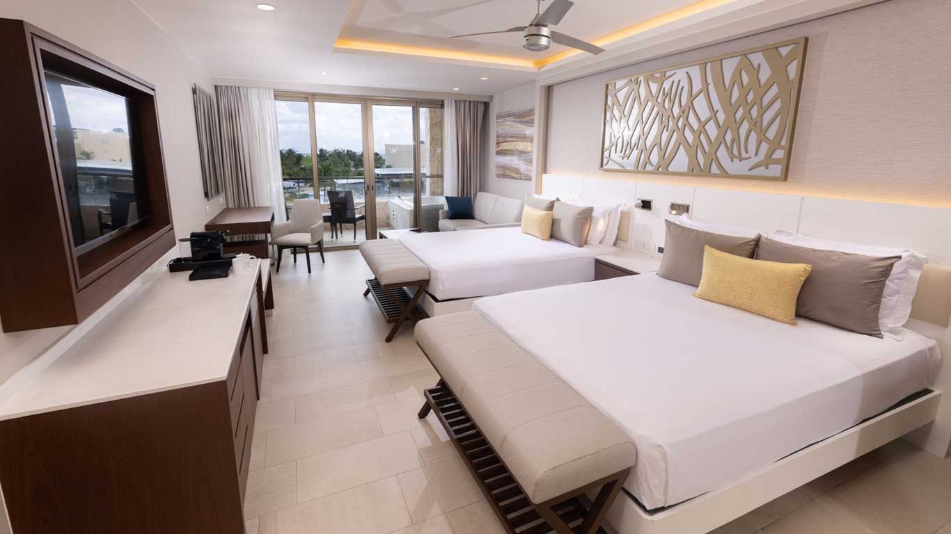 Take in sweeping ocean views from your private balcony, complete with an outdoor Jacuzzi for moments of pure relaxation. Inside, the suite offers a thoughtfully designed seating area with a sofa bed, creating ample space for the whole family to unwind. Enjoy the ease of room service and savor leisurely days in the comfort of your suite, soaking up tropical sunshine and making the most of time spent together.